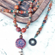 This is a necklace people will notice and admire. The bold, handmade polymer clay focal bead, by Staci Louise Smith, features her delightful doodle patterns - different on each side! You can gently twist the bead around, if you prefer the opposite side. I hung a pensive moon-face charm beneath the polymer bead. It just seemed like it belonged there, especially since the doodle pattern on the focal bead reminds me of the sun. Three sizes of burnt orange colored glass beads surround the polymer clay pendant. These beads all have a Picasso finish, which is a coating that is speckled and spotty; giving the beads a natural, earthy appearance. Little, tan spacer beads run throughout the necklace and every so often you'll find a little pop of turquoise to add depth and contrast to the design. Playing off the sun and moon theme; the lead free, antiqued brass toggel clasp features a decorative sunburst pattern. The necklace is 24 inches long and the pendant hangs 3 inches below that. This is a stunning piece that will make you feel special - because you are!