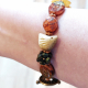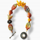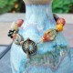 This one of a kind bracelet is full of delight! First there is the adorable ceramic bird by Carolyn Dewison. Just below her, is one of my hand woven beads in a dark green with a bronzy metallic sheen. Midway around the bracelet are four lovely amber beads and then, near the other end is a handmade, lampwork glass bead. The bracelet also features several types of Czech glass beads and a stunning antiqued brass toggle clasp with a sunburst pattern. It will become a staple of your fall and winter wardrobe.