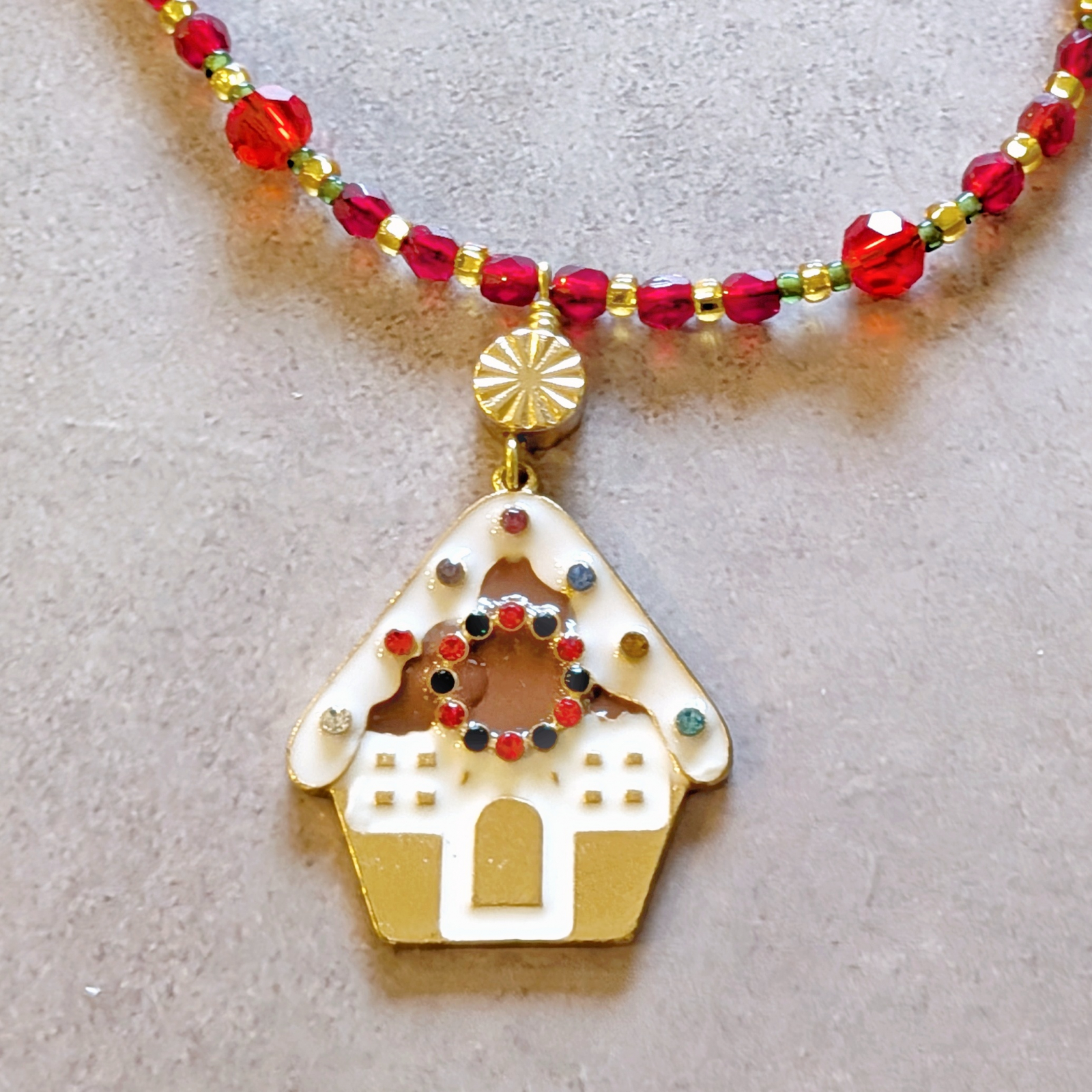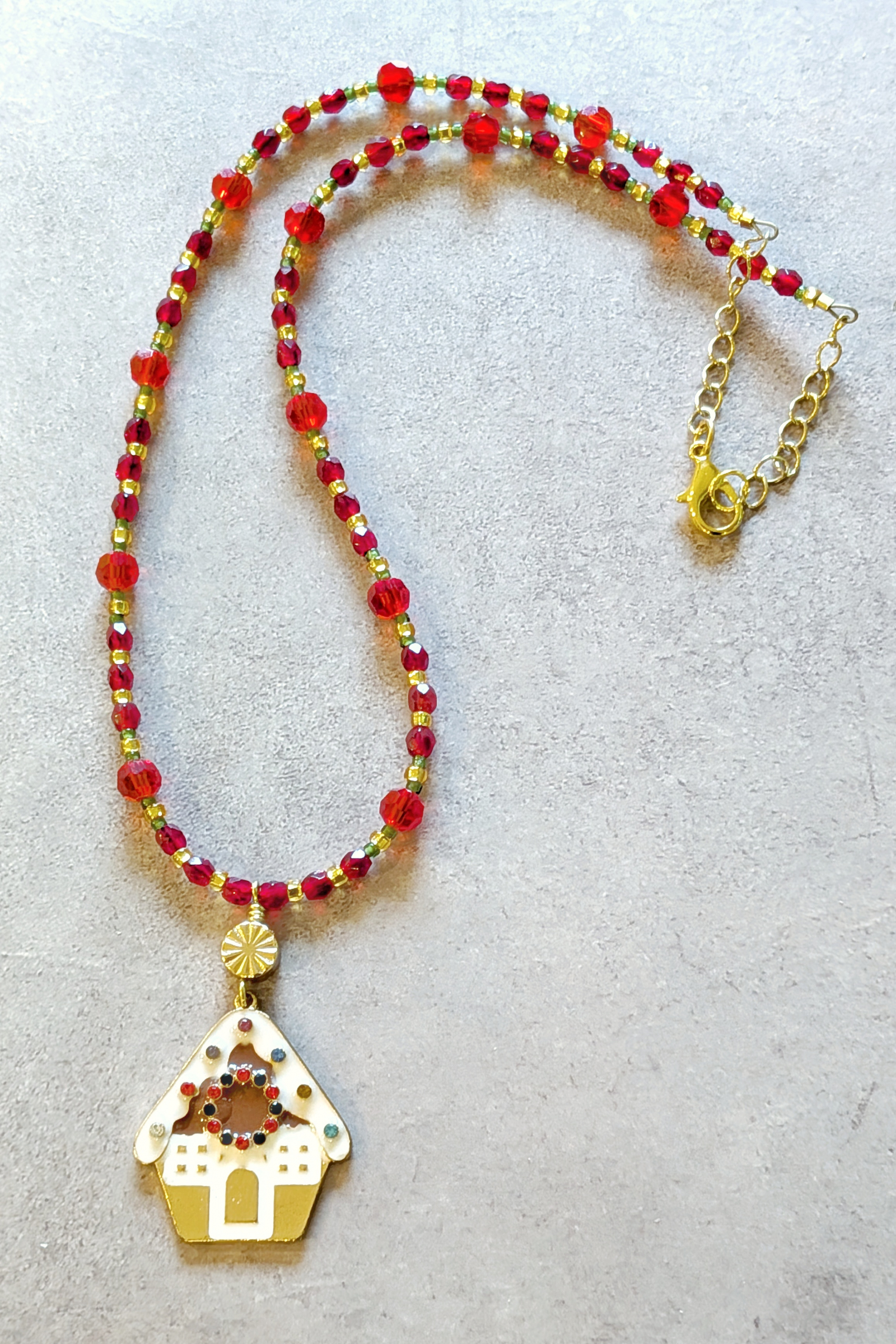 Capture the cozy feeling of a warm home on a snowy, winter day. This necklace features a gold-tone metal house with a snowy roof and a colorful red and green wreath above the door. There's a gold metal bead above the roof with a starburst pattern. The necklace consists of red faceted glass beads in two sizes, interspersed with small green and gold glass seed beads. This adorable Christmas necklace measures 20 inches long and it finishes with a gold tone, metal lobster style clasp.