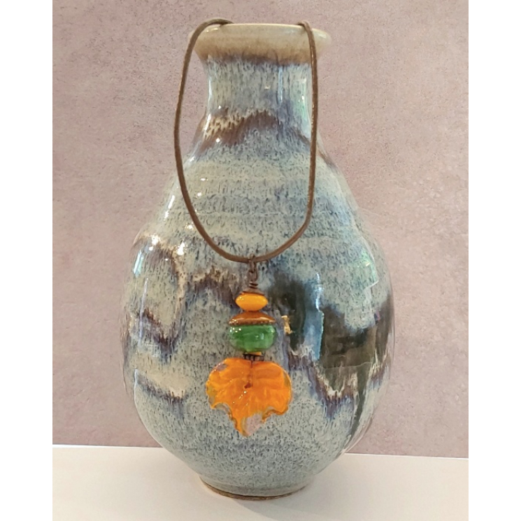 An artisan lampwork glass leaf forms the focus of this lovely pendant. The orange leaf is the topped with a small copper spacer and another handmade glass bead. The green lampwork bead has an orange, hand-enameled bead cap; with a small, orange Czech glass bead at the top. It was a joy to pull all these artisan beads together into one pendant. This happy medley hangs from a brown leather cord and is adjustable from 28½ - 29½ inches. It finishes with a lobster- style clasp.