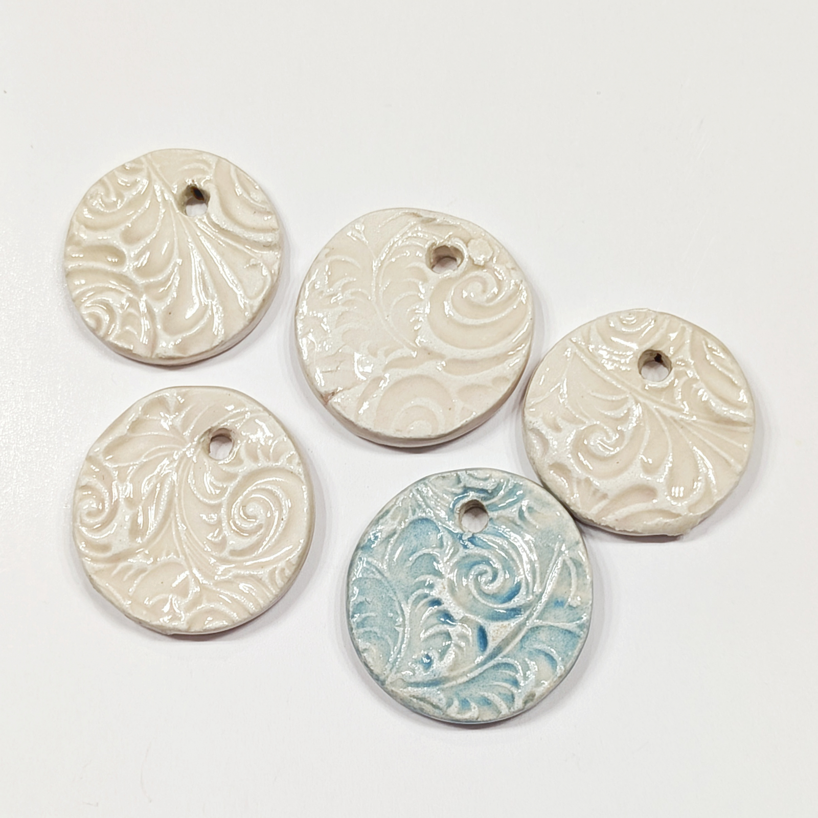 5 artisan ceramic charms by Bo Hulley. There are 4 off-white charms and one blue charm. These are perfect for earrings or to dangle off a bracelet or use as a component in a multi-part pendant. Very versatile. They measure ¾ of an inch across. This listing is for all 5 charms.