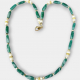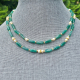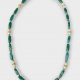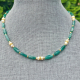 Elevate your style with this elegant semiprecious stone and pearl necklace. Green semiprecious stone beads, in sets of three, alternate with pairs of beautiful white, freshwater pearls. Faceted goldtone cube beads accent the green beads, while decorative daisy spacers sit between each pair of pearls. This is a lovely necklace on its own, but it also works well when layered with other necklaces. The last photo shows it layered with one of my other necklaces. This listing is for one necklace only. As I write this, the other necklace is also available on my website. The necklace measures 18¼ inches long.