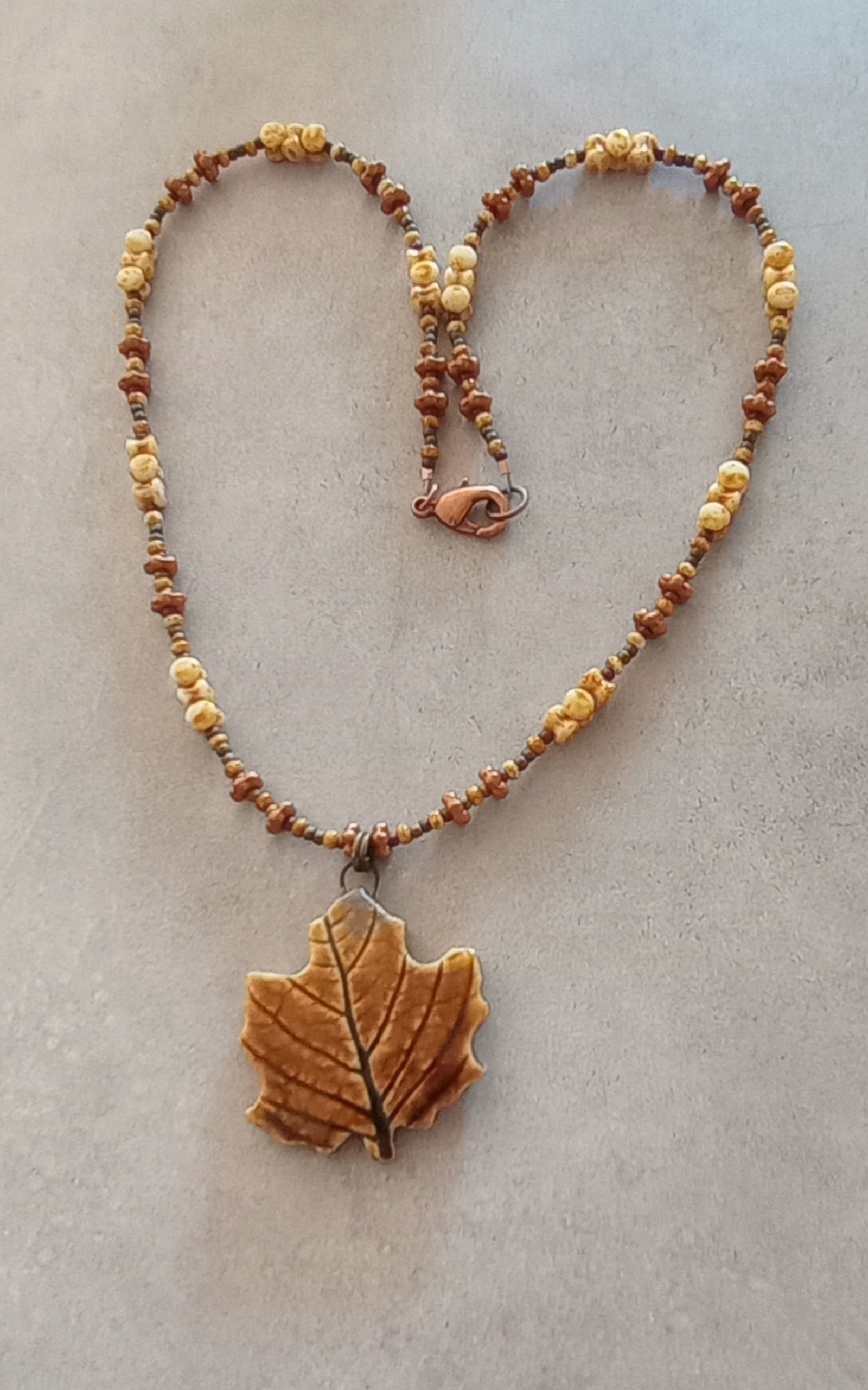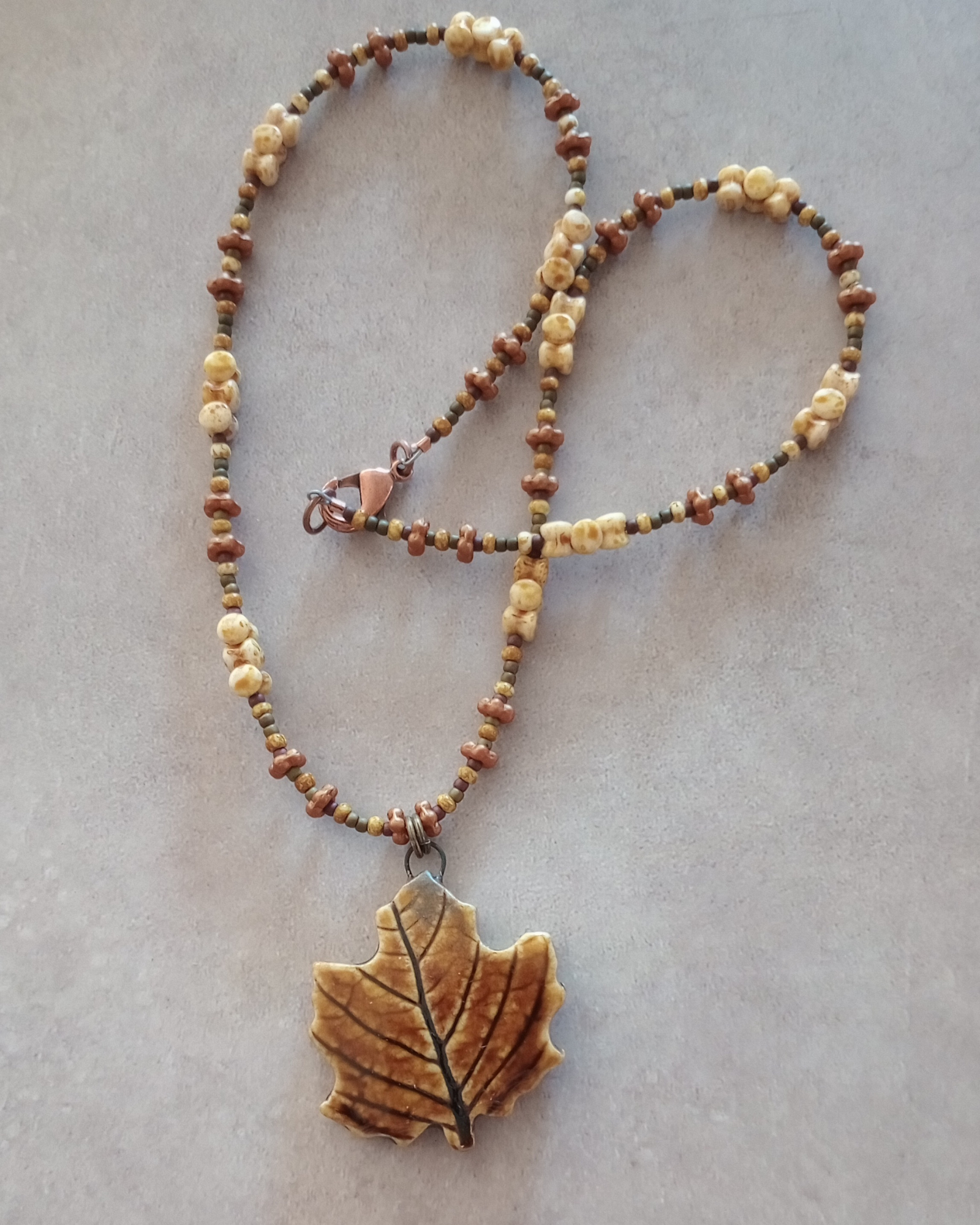 Leaf Necklace Artisan Ceramic Fall Autumn Brown And Cream