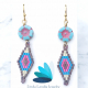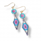 These cheerful and pretty flower earrings are the perfect accent for spring or summer wear. Blue Czech glass flower beads start things off. The centers of the flowers and the spaces between the petals are accented in bright pink. Small glass beads (called seed beads) are woven in a geometric pattern and dangle beneath the flowers. The woven bead pattern is outlined in slate gray, framing diamond patterns of cream, blue and pink beads. These earrings are very lightweight and have nice movement. They measure about 2½ inches long.