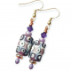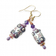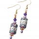 Beautiful, vintage German glass beads in purple, lilac and white are the center of attention in these stunning earrings. The German glass beads have a band of lilac glass around the center, with darker purple on either side. Dots of white glass, with deep purple centers create a striking, graphic pattern all around. The vintage glass bead is topped with a faceted purple luster bead and then a lovely, purple Swarovski crystal. At the bottom is the hand enameled end of a copper head pin, (the wire the beads rest on) and just above that is a metalic, purple glass disc bead. Altogether these beads create striking little artworks for your ears. These one-of-a-kind earrings measure 2 inches from the top of the gold-tone ear wire.