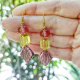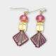 Combine artisan-made glass beads from Philadelphia, translucent cube beads from Mexico City and diamond shaped Czech glass and you've got a winning international combo. A glass artist friend of mine made the beautiful magenta beads on the top of these earrings. A lacey gold bead cap accents these handmade beads. Beneath them, I placed transparent yellow glass beads that I got in a fantastic bead store in the heart of Mexico City. Yellow and purple are opposite each other on the color wheel, making them a dynamic color combo. The grooved, purple diamond shapes, make a great contrast to the cubes and rounds above them. These earrings are eye-catching and fun to wear.
