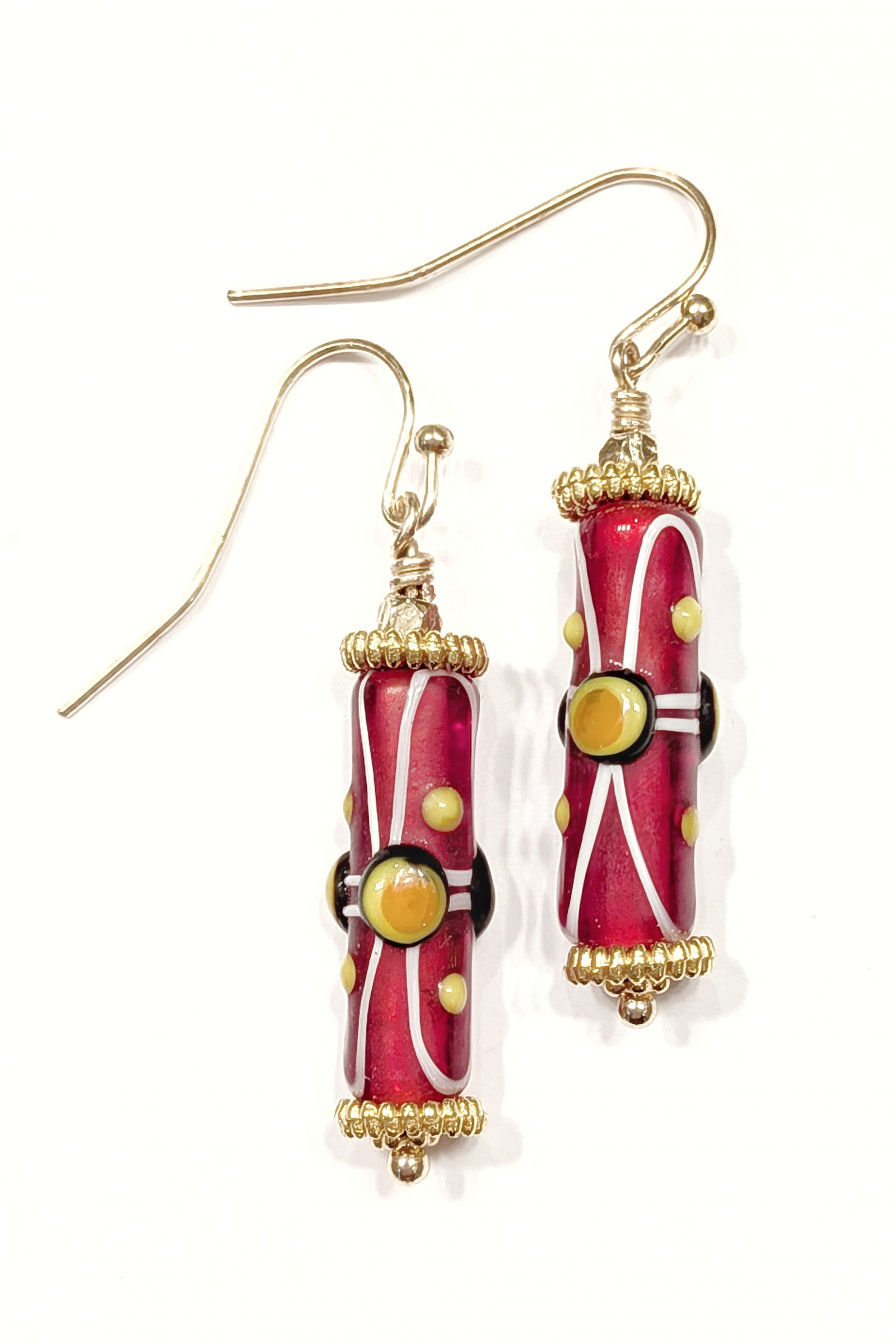 Red Cylinder Earrings Yellow Dot Gold Accents