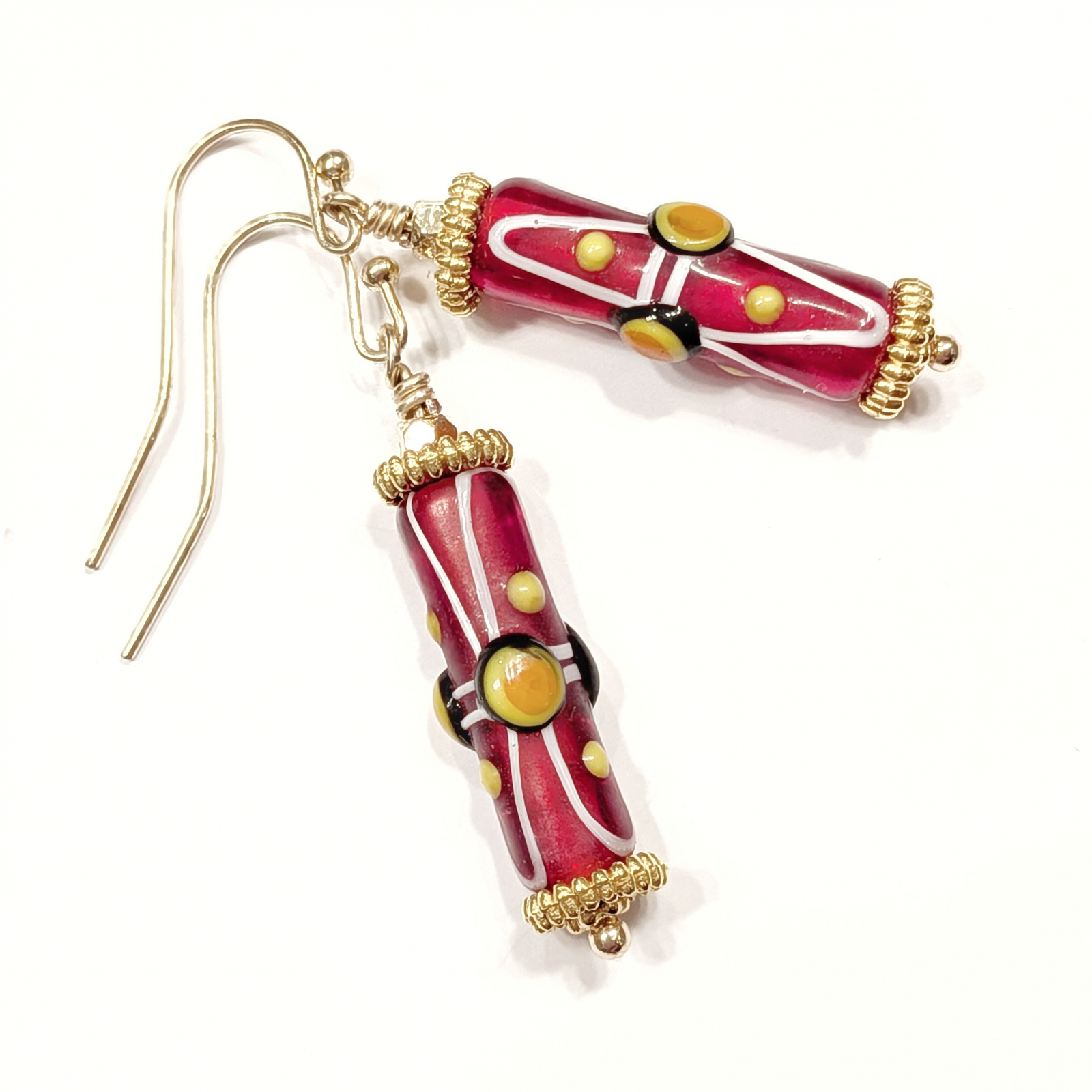 Fancy red glass cylinder beads are accented in white lines, with orange and yellow dots. I've never seen beads like these before, so I snagged a strand of them in several colors. I've paired them with decorative gold metal beads for a simple small earring with big impact. Lightweight and fun to wear! These earrings are 1¾ inches long.