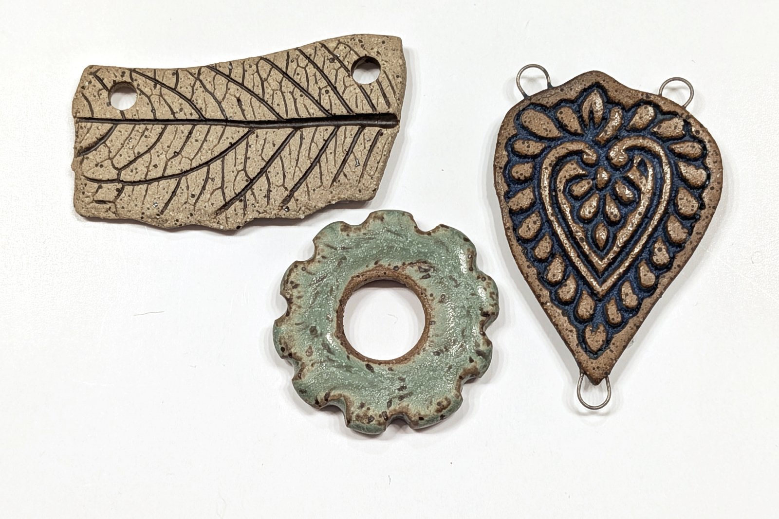 Set of 3 artisan ceramic focals by Diana Ptaszynski. The horizontal piece has the impression from a real leaf, with 2 holes, one on each upper corner. It measures 2 inches from side to side and 1 inch tall. The lovely heart has a deep blue glaze in the recessed parts of the design. The heart has 3 loops and is 2 inches tall and a bit over 1 ¼ inches from side to side. The rustic gear focal is 1 ¼ inches across.